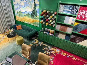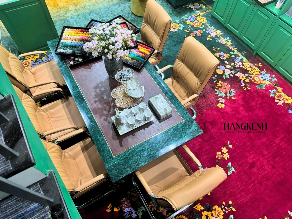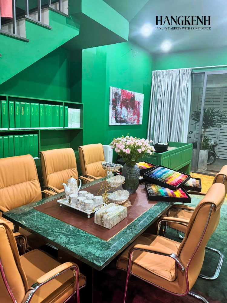 Không gian văn phòng được thiết kế như một “phòng trưng bày mở”, nơi khách hàng có thể trực tiếp cảm nhận chất liệu, màu sắc và họa tiết thảm. Đây cũng là nơi Hàng Kênh giới thiệu dịch vụ thiết kế “bespoke” – những tấm thảm được “đo ni đóng giày” cho từng không gian, mang đậm dấu ấn cá nhân và phong cách riêng biệt.
